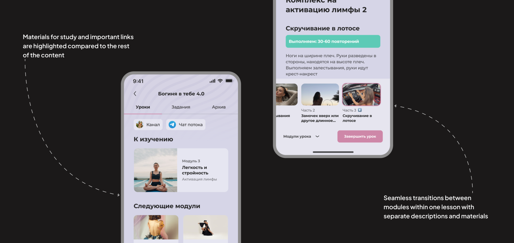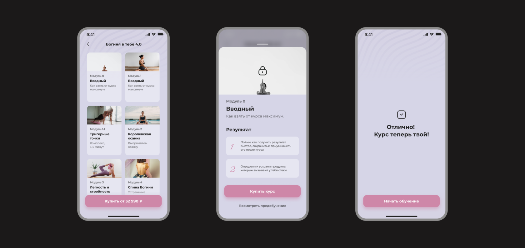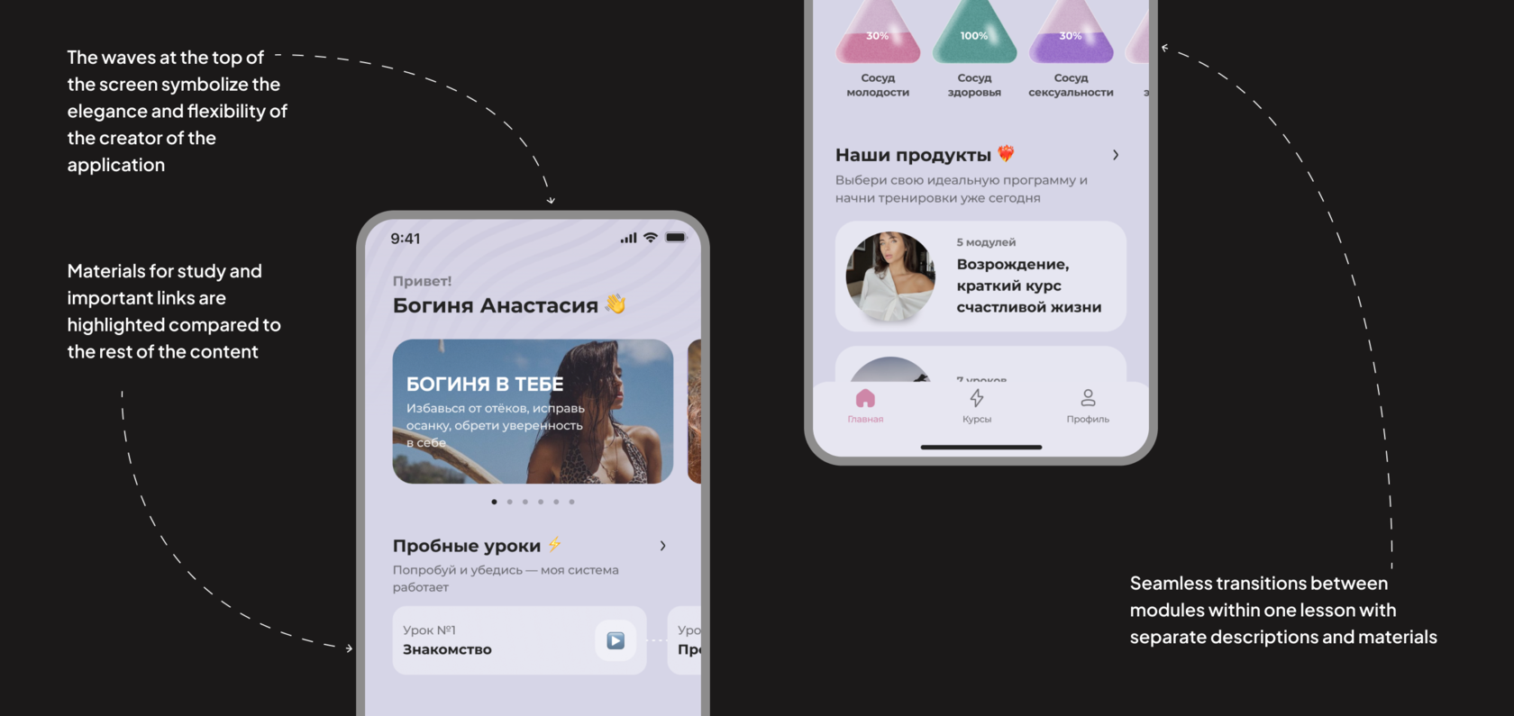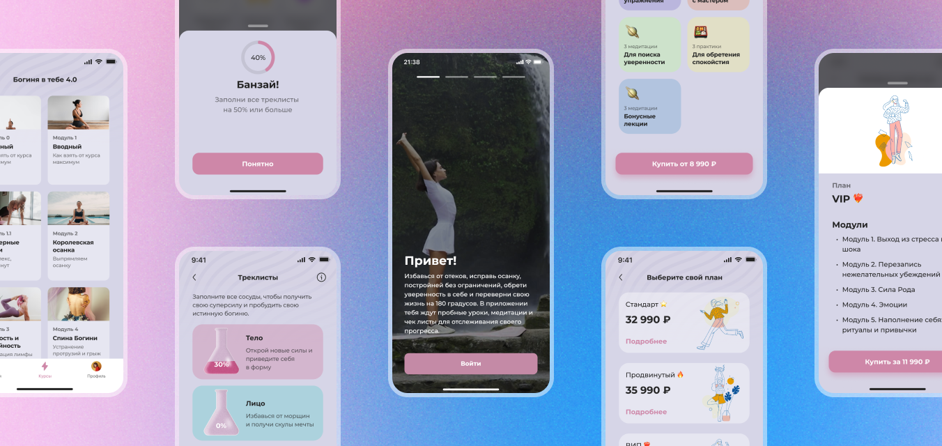 On the main page, we decided to add free features of the application. Users can use it to fill out playlists for posture, facial exercises, and nutrition, as well as access free courses
